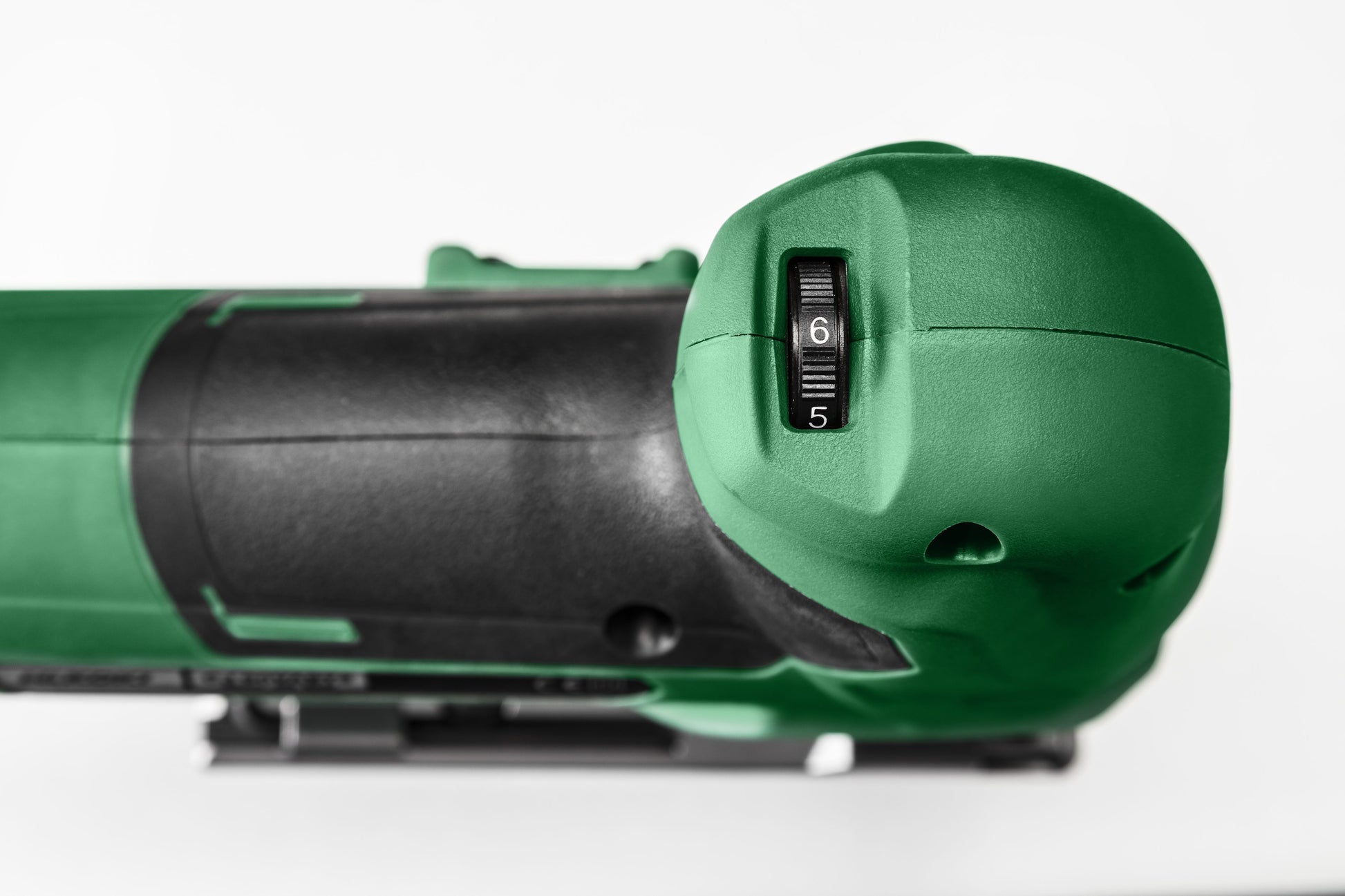Handflächengriff kompakt und leicht im Gewicht hohe Schnittgeschwindigkeit sehr stabiles Schneiden in Kurven langes Leben | „Power Lock System“: Sägeblatt schneller Wechsel ohne Werkzeug unterschiedliche Geschwindigkeit 3-fach einstellbarer Pendelhub Blasfunktion starke Aluminium- und Stahlbasis