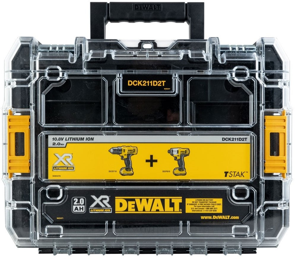 DeWALT TSTAK koffer behorende bij accu combisets. Deze koffers zijn bestickerd met de labels van de machines waar ze onderdeel van uitmaakten. De koffers zijn TSTAK compatibel en passen op alle DeWALT koffers uit de TSTAK range. De koffer wordt zonder inleg geleverd.