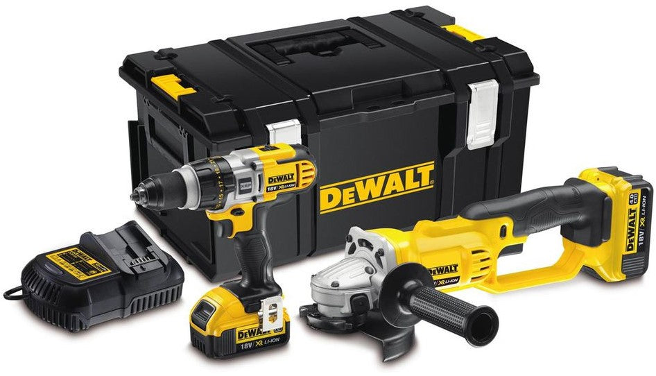 Inclusief: DCD985 XRP Schroef/Klopboormachine, DCG412 Haakse Slijper, 2 x 4.0Ah XR Li-Ion schuifaccu's, Multilader, DS150 Tough System,